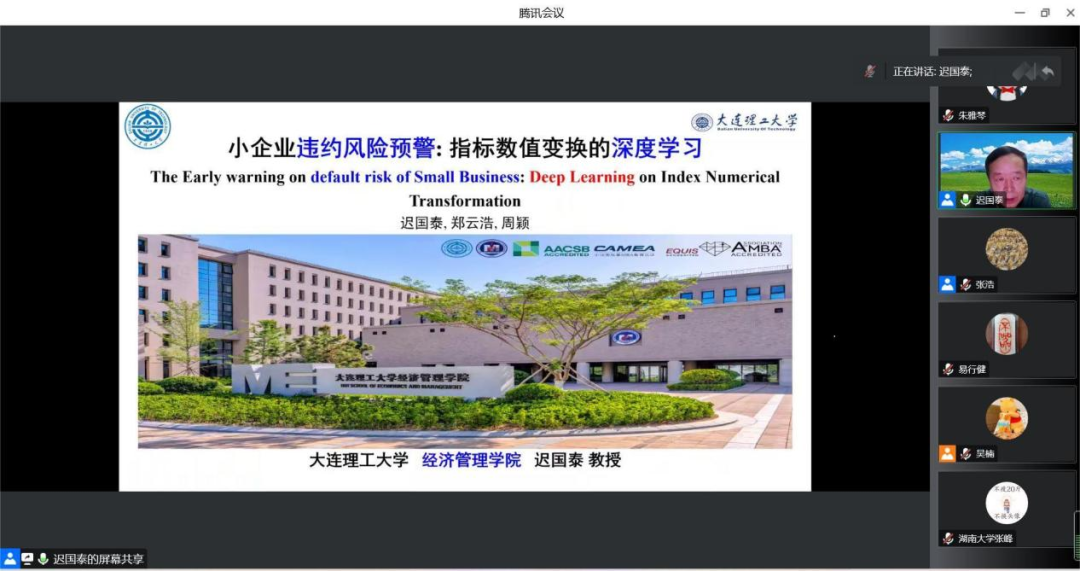 11月10日,大连理工大学经济管理学院教授迟国泰应邀做客广外金融论坛第100讲,通过线上会议的形式,以“小企业违约风险预警:指标数值变换的深度学习”为题为我院师生带来了一场精彩的学术报告。此次讲座由金融学院副院长张浩教授主持,我院博士生导师、广东金融学院副校长易行健教授以及学院多位教师参与了讲座并与专家进行互动交流,学院各年级研究生和高年级本科生也积极到会参与。